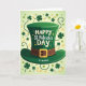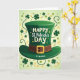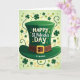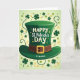 This card features a tall, deep emerald-green leprechaun hat centered on a lime-green gradient background, setting a festive St. Patrick’s Day scene. A warm brown band wraps the base of the hat, secured by a shiny gold buckle that catches the light like a small shared glance between friends 💚. Across the hat’s crown, the main message reads “HAPPY St. Patrick’s DAY” in white letters with a yellow outline, standing out clearly against the dark green. Tiny gold star accents sit near the lettering, adding little sparks that feel like inside jokes exchanged mid-celebration ☘️. Around the hat, shamrocks in several green tones drift across the space, some connected to curling dark-green vines that loop and twist like arms gently linking. Golden starbursts and ribbon-like flourishes float between the leaves, giving the layout a light, airy motion. Beneath the hat, “17 MARCH” appears in small, neat type, centered under the brim against the glowing green backdrop.