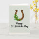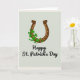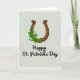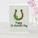 This card shows a warm, deep-brown horseshoe near the top, turned upward with tiny nail holes that add a realistic touch. Along the lower left curve, shamrocks tumble in different sizes and angles, mixing emerald and moss greens that feel like a small cluster gathered close together ☘️. The background is a muted sage green, giving the earthy browns and greens room to stand out without feeling busy. Beneath the illustration, the words “Happy St. Patrick’s Day” sit centered in flowing black cursive, stretching across the lower half. The smooth curves of the lettering echo the arc of the horseshoe, tying the layout together. The close, cascading clovers create a gentle sense of togetherness, as if they’re leaning in around the horseshoe like friends sharing a quiet laugh 💚. The shamrocks thicken toward the left and thin out as they trail downward, leaving open sage space on the right side of the card.