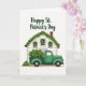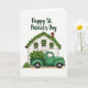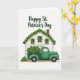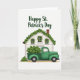 This card shows a simple white house set against a bright white background, dressed up for St. Patrick’s Day in layers of fresh green. A vintage-style green pickup truck sits out front, its open bed piled high with shamrocks, like someone just brought a gift for a close friend 💚. Along the gabled roofline, a shamrock garland drapes neatly, and the three front windows each hold a round clover wreath that feels like a gentle, welcoming touch. The scene is lit evenly, with soft shadows that make the house and decorations feel calm and cared for, as if two people decorated together and kept sneaking glances and smiles. Across the top, the text “Happy St. Patrick’s Day” is placed above the house in deep green lettering, standing out clearly without crowding the illustration ☘️. Several shades of green are used throughout the shamrocks to add depth, from darker leaves in the truck bed to lighter ones along the roof trim. Share St. Patrick’s Day sentiments with someone you care about.