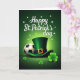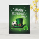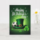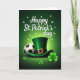 This card features a St. Patrick’s Day scene in layered greens, fading from deep emerald near the bottom to bright lime toward the top. At the lower area, a textured green leprechaun hat sits close to a black-and-white soccer ball, like two friends posed side by side for a festive photo. The hat’s black band and gold buckle catch the light, adding a warm gleam against the darker base tones. Near the top center, “Happy St. Patrick’s Day” appears in white, flowing lettering that stands out clearly on the green background. Around the words, small white shamrocks sparkle like tiny stars, and a few clovers drift across the field for a gentle, affectionate touch 💚. In the foreground, scattered three-leaf clovers guide the eye toward a brighter four-leaf clover at the lower right ☘️. The glowing clover sits just above the corner, edged by soft highlights against the green gradient.