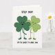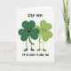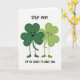 This greeting card shows two anthropomorphic shamrocks on a bright white background, leaning close like close friends sharing a private joke ☘️. The left shamrock is a deeper emerald green with a wide open smile and eyes gently closed, as if laughing at something the other just said. The right shamrock is a lighter lime green, giving a wink and a small grin that feels affectionate and a little teasing 💚. Both characters have simple black facial lines, thin stick arms and legs, and rounded little boots that make them look like they’re ready to stroll off together. At the top, “STEP MOM” appears in large, black, hand-drawn letters centered above their heads. Below the pair, “I’M SO LUCKY TO HAVE YOU” is written in smaller black text, placed neatly under their feet. The two shades of green stand out against the open white space, with the shamrocks side by side in the center and the text stacked above and below.