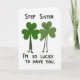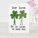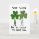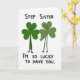 This greeting card shows two smiling shamrocks standing close together on a white background, their leafy shapes colored in two different greens that look great side by side 💚. Each has simple dot eyes and a wide grin, and their thin black arms link gently as if sharing a friendly squeeze. Slender black lines also form their legs and little feet, giving them a light, airy look without adding clutter. Above the pair, “Step Sister” appears in black, hand-drawn lettering centered near the top. Below them, “I’M SO LUCKY TO HAVE YOU” is written in matching black text, centered and spaced to feel balanced with the title. The brighter shamrock sits next to the slightly deeper green one, and the contrast makes their closeness stand out like a quiet little duet ☘️. The shamrocks stand side by side in the middle, with the top line of text floating above and the bottom line set neatly underneath.