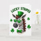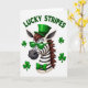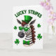 This greeting card features a zebra’s head and upper neck centered on a white background, its black-and-white stripes neatly defined beside a warm brown mane. The zebra wears an emerald green top hat, green wayfarer-style sunglasses, and a green bow tie, giving it a dressed-up look that feels like it’s ready to meet a favorite friend for a St. Patrick’s Day toast 💚. Four plump shamrocks float around the zebra, adding a festive frame that feels like friendly company gathering close. Above the zebra, the phrase “LUCKY STRIPES” curves in green, set in simple sans-serif letters that stand out clearly against the white space. The glossy highlights on the sunglasses and the subtle shading on the shamrocks add depth, like a gentle shine catching the light. The overall setting stays minimal and bright, letting the green accents and the zebra’s confident pose carry the charm ☘️. The green hat sits slightly angled, the bow tie is snug at the neck, and the shamrocks are spaced around the portrait with soft gradients and rounded edges.