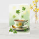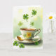 This card shows a white porcelain teacup with a yellow flower pattern and green leaves, edged with thin gold lines and a curved handle that feels gently elegant. It sits on a matching saucer where a gold spoon rests, catching a soft glint of light as if it’s been set down for someone you’re sharing the moment with. Inside the cup, an amber tea glows, and pale steam rises in curling strands that mingle with floating four-leaf clovers ☘️. Some clovers drift upward like they’re being carried on a quiet sigh, while others settle near the saucer as if lingering close, the way close friends or sweethearts linger at the table. The background fades from warm yellow at the top to pale green at the bottom, like a light wash of color that keeps the focus on the cup. Near the top, the greeting text sits in a green tone, spaced so it doesn’t crowd the steam and clovers 💚. The clovers range from deep emerald to lighter spring green, with a few tucked near the saucer and several suspended above the tea.