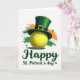 This card features an unexpected St. Patrick’s Day duo: a bright yellow tennis ball with white seams wearing an emerald green leprechaun top hat, giving the scene a friendly, cheeky charm 💚. The hat looks smooth and structured, wrapped with a black band and a golden buckle that catches the light. Behind the main image, wide horizontal brushstrokes of orange, white, and green sweep across the background like a loose nod to the Irish tricolor ☘️. The white space around the strokes keeps the focus on the ball and hat, while a soft shadow underneath makes them look lightly grounded on the page. Small shamrocks are scattered around the design, like little confetti floating near a couple sharing an inside joke. Near the bottom, the text “Happy St. Patrick’s day” sits centered in deep green lettering that matches the hat and ties the colors together. The yellow ball sits above the line of text, with the green hat tilted on top, framed by the orange-white-green strokes and sprinkled shamrocks.