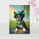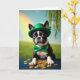 This design shows a Boston Terrier centered on the front, staring straight out with a calm, slightly pleading look that feels like it’s asking you to come closer. It wears an emerald-green top hat with a small shamrock and a matching green bow tie, setting a sweet St. Patrick’s Day mood 💚. Its black-and-white coat stands out against the bright green accessories, and the fine whiskers and glossy nose are picked out by soft, diffused light. At the bottom, its paws rest on a deep indigo surface where scattered gold coins glint like little gifts left for someone special. Behind the dog, a green field fades into a pale blue sky, and a soft rainbow curves across the distance 🌈. A thin sprig of green leaves hangs from the upper right corner, like a gentle frame leaning in toward the dog. The greeting text sits near the top in light green lettering, spaced to float above the hat without covering it. The background shows a grassy green-to-sky-blue gradient with a faint rainbow arc and a small leafy branch in the upper right.