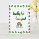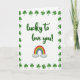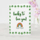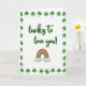 Designed with a bright white background, this St. Patrick’s Day card centers on the phrase “lucky to love you!” in rich green lettering that sits prominently in the middle 💚. The words feel like they’re leaning toward someone special, setting a sweet, close tone without needing any extra characters. Beneath the text, a classic rainbow curves in a full ROYGBIV sweep, like a shared smile stretching across the page 🌈. The rainbow appears to rest on two soft, pale clouds, giving the scene a light, airy setting. Around the edges, an emerald-green border of shamrocks is softly blurred, creating a gentle frame that doesn’t distract from the message. The shamrocks form a loose halo that hints at luck and togetherness while keeping the focus on the center. The final look shows the rainbow and clouds anchored under the green phrase, with the shamrock frame fading subtly toward the corners.