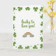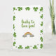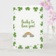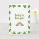 This card features the phrase “lucky to love you!” centered near the top in deep green lettering on a bright white background, setting a sweet, close-to-you tone. Just below the words, a small 🌈 arcs gently between two soft grey clouds, like a shared little moment hovering in the open space. Around the edges, a border of green shamrocks frames the scene, with clovers in slightly different sizes that feel like they’re leaning in toward the message. Tiny star-like asterisks are sprinkled among the shamrocks, adding a light sparkle without crowding the page. The strong green of the text matches the clovers, tying everything together while keeping the center easy to read. The open white field leaves plenty of breathing room, making the rainbow and clouds feel like a quiet bridge between two people. A few shamrocks sit closer to the corners while others line the sides, all in the same rich green with small asterisk accents tucked between them ☘️.