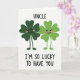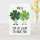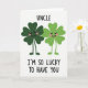 This greeting card shows two four-leaf clovers standing close together on a plain white background, angled slightly inward as if sharing a private joke 💚. One clover is a deeper forest green and the other is a brighter lime green, and their matching rosy blush circles make them look fond of each other. They have wide black eyes and small curved smiles, with the brighter clover showing a tiny pink tongue that adds a teasing, friendly note ☘️. Thin stems act like legs, ending in rounded little feet that keep the pair centered and steady. At the top, the word “UNCLE” appears in black uppercase letters, spaced neatly above their leaves. Below the clovers, “I’M SO LUCKY TO HAVE YOU” is written in black uppercase text that stretches across the lower area. The overall layout keeps the characters in the middle with lots of white space around them, and the blush pink cheeks stand out against the two greens. The black text frames the scene above and below while the clovers’ green leaves remain the main focus in the center.