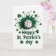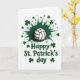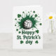 This card shows a black-and-white volleyball centered on a bright emerald splash that spreads outward across a white background, like a burst of celebration. Around it, shamrocks in many sizes scatter and drift away from the center, giving the scene a lively, shared moment that feels like teammates and close friends cheering side by side 💚. The contrast between the shaded ball and the flat green shapes makes the middle of the design stand out, while the shamrocks add a gentle sense of motion ☘️. Beneath the graphic, the words “Happy St. Patrick’s day” sit centered near the bottom in matching green text. The lettering uses a classic serif style, with smooth spacing that keeps it easy to read without taking attention from the artwork. Small clover flecks near the splash look like they’ve just been kicked up by a quick serve, adding a touch of connection and energy. The green shapes radiate from behind the volleyball, and the shamrocks thin out as they travel toward the edges of the card.