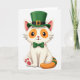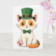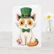 Designed with a white cat centered on a bright white background, this St. Patrick’s Day illustration keeps the focus on one sweet character. The cat’s wide, dark, glossy eyes catch a small highlight, giving it a tender, attentive look as if it’s waiting for a friendly hello 💚. A rich green top hat with a gold buckle and a black band sits neatly on its head, paired with an emerald green bow tie tucked under its chin. Warm orange circles around the eyes add contrast to the white fur, while a tiny pink nose and a slight smile make the face feel welcoming. On the left paw, three soft red paw pads show clearly, adding a gentle, touchable detail. The design stays uncluttered, and the greeting appears near the top in green lettering with a small shamrock accent ☘️. Its tail curves to the side in alternating orange and green stripes.