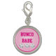 Three white dice and pink background. Add your own personalized monogram, name, company name, personal name or other custom text. Bunco Babe charm is a great Bunco prize. Keep on rolling!