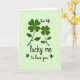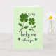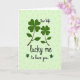 This card features two stylized four-leaf clovers in deep emerald green, centered on a pale lime green background that feels calm and close, like a quiet moment shared. Their curved stems lean gently toward each other, suggesting an affectionate bond without needing any extra scene. Above them, the words “Dear Wife” sit near the top in dark green lettering, standing out clearly against the lighter field. Below the pair, “lucky me to have you...” appears in the same dark green, with a few small clover accents nearby that echo the main motif ☘️. The big clovers are edged with thin white outlines, giving them a soft lift from the page and a touch of depth. Across the background, a faint pattern of tiny clover shapes repeats lightly, adding texture while keeping the focus on the couple-like clovers 💚. The layout stays centered and balanced, with the top line of text, the clovers, and the lower line forming a neat vertical stack over the subtle clover print.