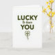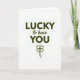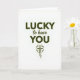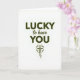This card features the phrase “LUCKY to have YOU” centered on a bright white background, with “LUCKY” at the top and “YOU” below in large uppercase letters. Between them, “to have” appears in a thinner, flowing style, like a softer voice tucked into the middle of the message. The lettering and icon are a muted olive green, giving the design a calm, nature-leaning look 💚. A simple outlined four-leaf clover sits directly beneath the text, like a small token offered between close friends or partners ☘️. The spacing feels airy, leaving plenty of white space around the words so the message lands gently rather than loudly. The contrast between the thicker uppercase words and the lighter middle phrase suggests steady affection with a tender undercurrent. Under the final line, the clover outline is centered and drawn with the same olive-green stroke.