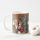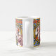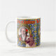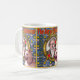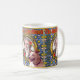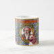 Dogs love classical music. At some animal shelters, the dogs go to sleep each night with the soothing sounds of classical music. When the music begins, they all stop barking and settle down to sweet dreams. The designs in this "Dogs love classical music." series celebrate the intuitive connection between dogs and this wonderful music. The design on this mug features a portrait of the composer Ludvig van Beethoven. The portrait is in an ornate gold frame, on a wallpaper background of yellow suns and uplifting spirits against a medium blue. In front is a photo of a dog, commenting (in English and French), and pointing with red arrows to the composer. The text says "The Joy of Beethoven", with reference to his ninth symphony, Ode to Joy.