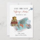 Luggage Map Destination Wedding Save The Date with vintage map and suitcases, passport and airplane for your travel destination wedding.