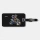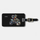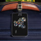 This image features a personalized rectangular luggage tag attached to the handle of a dark blue, textured suitcase. The tag has a sleek black background and displays a dynamic, action-style illustration of a motocross rider in full gear performing a stunt on a dirt bike. The name "Vivian" is printed clearly at the bottom in a simple white font. It is secured to the suitcase with a black leather strap and a silver buckle.