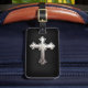 Metal cross on black leather background