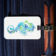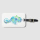 This luggage tag is shown in white with a lovely blue seahorse print design.