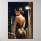 Painting of a beautiful young Latina in an elegant backless cocktail dress standing under a streetlight at night in downtown Miami.