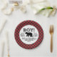 Celebrate in style with this personalized lumberjack baby shower paper plate. It features bold lettering, a bear among foliage and a buffalo plaid pattern around the edge. It makes an adorable theme for your baby boy shower. Personalize it with the mother to be's name and date of the shower. Designed for you by Blackberry Boulevard.