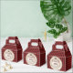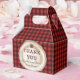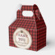 Stylish favor boxes with a red and black buffalo plaid pattern and tree stump design.