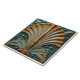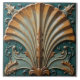A raised, stylized seashell design in the center, with a color palette of teal, gold, and cream. The seashell is composed of ribbed segments that fan out from a central stem, with the gold paint appearing distressed, revealing cream underneath. The background is teal, adorned with ornate, swirling patterns and floral motifs in gold and cream. The overall style is reminiscent of vintage architectural details, with a slightly weathered texture that adds to its antique charm.