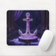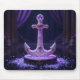 A photorealistic, highly detailed sculpture of an anchor crafted from polished porcelain and smooth ivory, exhibiting a subtle cream to off-white sheen. The anchor features intricate Arabian-inspired arabesques, geometric patterns, and delicate calligraphy, accented with multifaceted gemstones and gleaming gold edges. It glows with deep violet light emanating from within, particularly around the embedded gems. The anchor rests on a simple dark pedestal surrounded by scattered crystal shards that catch and reflect the purple glow. Placed on a highly polished reflective surface, the anchor’s glow and the surrounding particles create dramatic reflections. The softly blurred background hints at deep purple drapery and bokeh lights, emphasizing the opulent, magical, and slightly mysterious atmosphere.