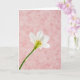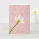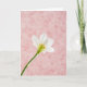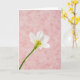 This card shows a single white flower photographed up close from a low angle, rising from the lower left as if leaning in for a gentle hello ❤️. The smooth green stem forms a strong diagonal that guides your eye toward the open bloom, where the petals look softly lit and slightly see-through at the edges. Behind it, a calm pink background with a faint, abstract texture sets a tender, romantic mood, like a quiet moment shared between close friends. The brightest detail is the warm yellow cluster at the center, adding a small spark against the pale petals and rosy backdrop 🌼. Any greeting text would sit neatly in the open space on the upper right in a soft gray or muted gold, with a smaller line near the bottom left to balance the stem’s angle. The overall scene feels airy and intimate, with the flower’s fine petal lines giving it a delicate, cared-for look. The petals are pearly white with subtle striations, and the backdrop stays blush pink with a gentle, mottled pattern.