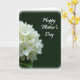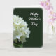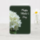 Designed with a gentle, intimate mood, the image centers on a full cluster of creamy white flowers filling the left half, their layered petals opening around faint green centers as if leaning toward someone close ❤️. Against the right side, a deep dark-green background creates strong contrast that makes the blossoms look softly lit and tender, like a quiet thank-you shared between loved ones. The lighting falls across the petals in a calm glow, bringing out their smooth texture and slight shadows between folds. On the open dark area to the right, the words “Happy Mother’s Day” appear in white, placed where the negative space keeps the message easy to notice. A small touch of warmth comes through in the way the flowers seem to reach into the darker side, like a gentle gesture of closeness 🌼. Near the bottom left, a single bright green leaf peeks out, adding a fresh accent and a grounded, natural detail. A soft vignette darkens the edges slightly, framing the flowers and the white lettering on the right.