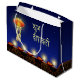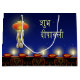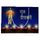Happy Diwali illustration: A shiny Diwali lamp with red diyas (cup-shaped indian oil lamps) with an ornamental border on a night sky background and the greeting written in Sanskrit.