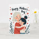 Designed with a tender embrace at the center, this illustration shows an adult and a child holding each other closely, eyes closed as if sharing a quiet, affectionate pause ❤️. The adult has soft, light-toned hair and calm features, wearing a deep red top dotted with darker specks, while the child rests their head on the adult’s shoulder in a white shirt patterned with small yellow and red flowers. A bright white background keeps the scene airy and lets the warm reds and sunny florals stand out without distraction. Around them, scattered heart shapes in crimson and muted blue-grey float across the space, with tiny orange dots adding a gentle, confetti-like touch. Dark green leafy sprigs sit near the lower edges, subtly framing the figures and giving the scene a grounded, garden feel 🌼. The message “Happy Mother’s Day” appears in black lettering near the upper area, clear and easy to spot against the white. The figures are drawn with smooth, rounded contours, and the child’s floral shirt repeats small petal shapes that echo the hearts nearby. Several hearts cluster more densely near the upper corners, while the green foliage gathers along the bottom border.
