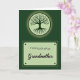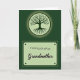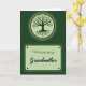 This card features a deep green background split into an upper emblem and a lower message panel, creating a calm, cozy scene ❤️. In the top half, a glowing circular symbol holds a stylized tree with fine roots spreading downward and soft, leafy branches reaching out like an embrace. The pale green glow around the tree feels like a quiet promise of closeness, as if family members are gently holding on to one another across time. Beneath it sits a light pastel-green rectangle with rounded corners, like a small nameplate set carefully in place. Near the top of that panel, the words “From both of us” appear in a simple, easy-to-read dark green font, leaving comfortable space around the letters. Below, “Grandmother” is written larger in a flowing, cursive-style dark green lettering, adding a tender, affectionate touch 🌼. Small dark circular dots sit at each corner of the panel, like little fasteners against the soft green plaque. The tree emblem shines in pale green above the centered text, with delicate leaves and branching lines clearly visible inside the circle.
