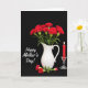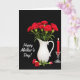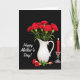 This greeting card features a dramatic still-life scene set against a deep black background, where a white ceramic pitcher catches a soft highlight and feels calm and caring. The pitcher is filled with a lush bundle of ruffled crimson flowers and leafy greens, their petals spreading outward like a warm embrace ❤️. A few matching blooms rest near the base, as if they slipped down gently and were left there on purpose, adding a quiet, affectionate touch. On the right side, a slim red candle burns with a small golden flame, its light creating a cozy glow that suggests closeness and gentle attention. The candle sits in a clear, fluted glass holder that reflects tiny glints of light, bringing a delicate sparkle to the dark setting. On the left, the words “Happy Mother’s Day!” appear in white lettering, standing out clearly against the darkness and balancing the arrangement 🌼. The red candle stands to the right of the pitcher, with the flame hovering just above the candle’s tip and the glass holder visible at its base.