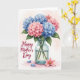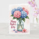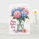 This greeting card features a full bouquet of clustered flowers in a clear glass vase, painted in soft watercolor-like washes that feel gentle and affectionate ❤️. Rounded blooms in powdery blue sit beside blush-pink blossoms, with deep green leaves fanning out like a protective embrace around them. The see-through vase shows stems dipping into water, adding a calm, realistic touch against the pale, lightly shaded background. Along the left side, the words “Happy Mother’s Day” appear in rich crimson lettering, standing out clearly without crowding the bouquet. The balanced colors and airy spacing give the scene a quiet closeness, like a thoughtful gift set down with care. Near the base of the vase, a single small pink flower with a golden center lies as if just placed there, suggesting a tender moment of giving 🌼. Two loose blue petals rest nearby on the surface, slightly separated from the main arrangement.