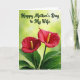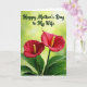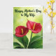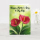 This card features a close-up photo of two heart-shaped red blossoms leaning toward each other like a couple sharing a quiet moment ❤️. Each flower has a slim yellow center that stands out against the velvety red petals, and the blooms rise from a cluster of deep green leaves at the bottom. Behind them, the background fades into a soft green blur with small light spots, like sunshine filtering through a garden. Near the top, the message “Happy Mother’s Day to My Wife” sits centered in dark green, written in flowing cursive-style lettering. The dark green text echoes the leaves below, tying the greeting into the natural scene without overpowering the flowers. The rich reds and greens create a warm, romantic contrast, while the slight curves and tiny natural imperfections in the petals make the flowers feel tender and real 🌼. The two blossoms sit side by side in the middle of the frame, with their yellow centers angled slightly upward against the glowing green backdrop.