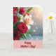 This card features a lush bouquet filling the upper two-thirds, with several deep red roses that curl inward like they’re leaning toward one another ❤️. A large, dark crimson bloom sits in the left front, its layered petals forming a tight spiral that draws the eye. Nestled among the reds is a soft white flower with a gentle peach tint at its center, adding a tender contrast like a quiet companion in the arrangement. Small green buds and leafy stems weave through the flowers, giving the scene a fresh, just-picked look. A warm golden light falls from the upper right, glazing the petals with soft highlights and giving the bouquet a cozy, affectionate glow. Along the lower edge, a short Mother’s Day message appears in a flowing, dark-toned font, centered and kept small so the flowers stay in focus 🌼. Behind everything, a cool gray background fades into a hazy blur with scattered, round light spots that shimmer like distant lanterns.