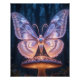 A photorealistic, ethereal scene featuring a giant luminous moth with wings patterned like delicate lace, glowing softly in shades of lavender, peach, and pale blue. Its spiraled antennae are tipped with tiny, bright sparks, adding a magical touch. The moth rests atop a large, glowing mushroom in a dimly lit, enchanted forest. Soft ambient light illuminates subtle details of the surrounding flora and mist, creating a delicate, whimsical, and dreamlike atmosphere.