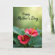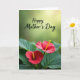 This card features two tropical flowers nestled at the bottom, their heart-shaped red petals leaning toward each other like close companions ❤️. Each bloom has a slim, upright yellow center that catches the eye against the deep green leaves below. The leaves are broad and textured with visible veins, creating a lush base that frames the flowers with a gentle, affectionate closeness. Behind them, the background fades into a soft blur of green tones, with warm light drifting in from the upper right like late-morning sun in a quiet garden. Near the top, the words “Happy Mother’s Day” appear in dark lettering across the lighter green area, leaving plenty of open space around the message 🌼. The text sits above the flowers so the greeting feels like it’s floating over the scene rather than covering it. The overall layout keeps the flowers grounded in the lower portion while the upper area stays airy and calm. Two crimson blooms with golden-yellow centers rest over layered green leaves, set against a softly blurred green backdrop with a warm highlight in the upper right.