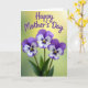 This greeting card features three detailed blossoms set close together, like friends leaning in for a photo, ❤️ against a softly blended background that shifts from muted green at the bottom to warm yellow near the top. Each flower has deep violet outer petals that fade into white toward the center, creating a gentle contrast that feels tender and inviting. Fine dark lines fan outward from the pale centers, drawing your eye toward a bright yellow middle that adds a sunlit touch. The lighting is soft and diffused, giving the petals a calm glow and a quietly romantic, cared-for look. Near the top, a celebratory message sits above the flowers in textured purple lettering that echoes the petal color, with tiny sparkly highlights that catch the light. The background is slightly blurred so the blooms and the message stand out clearly, keeping the focus on their delicate details 🌼. The upper area shows the purple text centered over the trio, with the yellow gradient behind it and the violet-and-white petals sharply defined in the foreground.