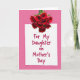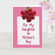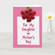 This design shows a glowing fuchsia background that immediately frames a romantic, celebratory scene. A lush bouquet of deep red roses spills down from the top edge, with layered petals that curl into tight spirals and hint at a tender, affectionate gesture ❤️. Fresh green stems peek through the blooms, adding a natural contrast against a bright white note card placed below. The card sits centered in the composition, its crisp edges standing out against the saturated backdrop. Across the front of the card, a message appears in red lettering, positioned prominently in the middle and easy to read: “For My Daughter on Mother’s Day.” Soft, diffused light smooths out shadows and brings out the velvety texture of the roses while keeping the paper surface looking smooth and bright 🌼. The intense pink background, scarlet flowers, and white card form a strong trio of colors, with the bouquet cascading from the top toward the card beneath.