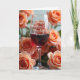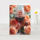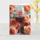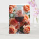 On the front of the card a clear stemmed glass stands centered, filled with a deep ruby-red drink that catches the light like a quiet toast between close friends ❤️. White lettering curves across the bowl of the glass in a flowing style, placed front and center so it’s the first thing you notice. Around the glass, roses cluster in soft peach and gentle coral, some fully open and others still curled, as if leaning in toward one another. The nearest bloom shows layered petals with a tender, almost embracing curl, while the flowers farther back fade into a soft blur that adds depth. Warm, gentle lighting glows along the glass rim and highlights the velvety petal edges, giving the scene a calm, intimate mood. Behind everything, a muted blue-green background stays smooth and quiet, letting the warm florals and red drink stand out without distraction 🌼. A single foreground rose sits low and close, its tightly coiled center framed by softly unfurling outer petals.