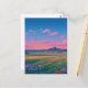 This stunning postcard captures a peaceful golden hour transition over an expansive valley. The foreground is alive with a lush carpet of purple, white, and orange wildflowers nestled in deep green grass. The scene opens up to vast, rolling plains that lead the eye toward a sharp mountain silhouette on the horizon. Above, the sky is a masterpiece of color, blending a warm orange and pink glow with a deep azure blue punctuated by the first shimmering stars of evening. Soft, fluffy pink clouds drift across the horizon, adding a dreamlike quality to this serene nature portrait. This postcard is a perfect choice for sending a cheerful hello, a nature-inspired greeting, or as a beautiful decorative keepsake for those who love mountain landscapes.
