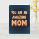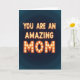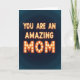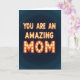 This card features large, three-dimensional letters in an orange-gold tone that read “YOU ARE AN AMAZING MOM,” set prominently across the center like a stage sign ❤️. Each letter is dotted with evenly spaced round bulbs that glow warmly, giving the message a cozy, celebratory shine. The gentle gradients on the lettering and the soft shadows underneath add depth, like the words are lifting off the surface. The bright lights feel like a loving spotlight, as if someone close is proudly cheering her on from the front row. The text sits against a dark background of deep blue and teal rings that ripple outward, creating a tunnel-like pull toward the middle 🌼. Those cool, curved bands add motion and contrast, making the warm lettering feel even more inviting. The bulbs appear as small, bright spheres arranged in neat lines within each letter, while the blue-and-teal arcs form concentric waves behind them.