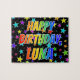 This exciting and vibrant birthday-themed jigsaw puzzle design has the message "HAPPY BIRTHDAY, LUNA" with the characters having a colorful rainbow spectrum inspired gradient pattern, in addition to a lively stars background pattern. A vibrant puzzle like this might be a fun way to send a birthday greeting message to somebody named Luna. [~Z0000468]