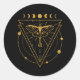 A mystical design showcasing a luna moth surrounded by geometrical shapes, celestial spheres, and the phases of the moon. Luna moths are among the largest moth species in North America, with a wingspan of 3 to 4 inches. Adult luna moths do not eat at all, and therefore have only vestigial mouthparts and no digestive system. Their sole purpose in life is to reproduce. They have only about a week to do so before they die. The luna moth embodies not only the full moon in its pale majesty but also the new moon in its obscurity and unrevealed potential.