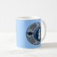 A white cat on a Celtic knot moon medallion in blue and silver gray.