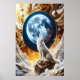 A majestic white wolf howls at the moon, bathed in a golden light, against a backdrop of swirling clouds and celestial bodies. The wolf stands on a rocky outcrop, its silhouette framed by the crescent moon.