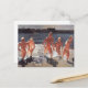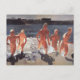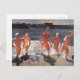 This postcard features a 1935 painting titled "Lunch Break" by Aleksander Deineka. The painting depicts a group of handsome, athletic young blond men running ashore after a swim in the water at the beach.
