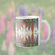 This lovely cofee mug design features a beautiful vintage look pattern of lupine flowers in blue, purple, and peach, with butterflies hovering, and rich foilage. The pattern is reminiscent of British textile patterns from the late 1800s and early 1900s, with its muted colors and rich shapes and patterns. This artwork is based on generative content artwork, which has been spun into a "kaleidoscope" style repeat pattern. Lupines have beautiful tall spires of pea-like flowers, and attract pollinators like bees. Add some retro floral flair to your morning coffee or evening tea drinking routine with this boho chic drinkware mug.
